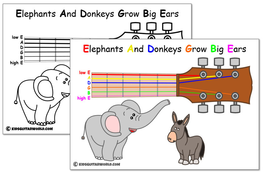 I have created some free guitar lesson printables to help you with this part of your course. The color version can be printed as a poster and hung on the wall of your classroom. The black and white version is perfect for handouts and homework. Ask your young students to color it in and at the same time memorize the string names.