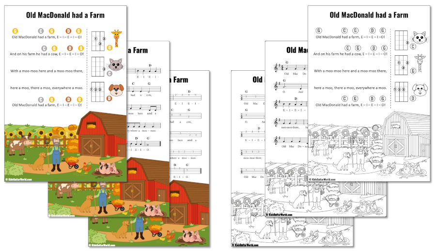 Each songs comes in a color and in black & white version. In this way you have the full flexibility to add a coloring activity to your guitar lessons. Children love to color illustrations and this will make your lessons much more attractive. The black and white version allows kids to have fun and to get more familiar with the song at the same time.